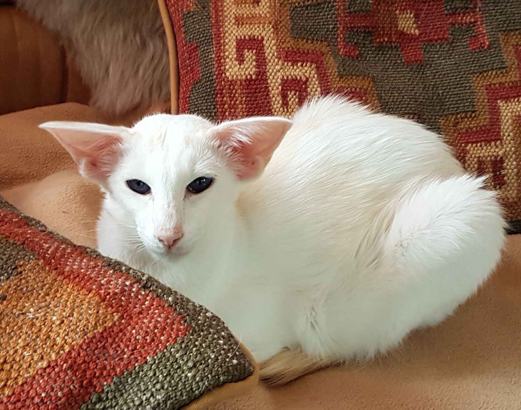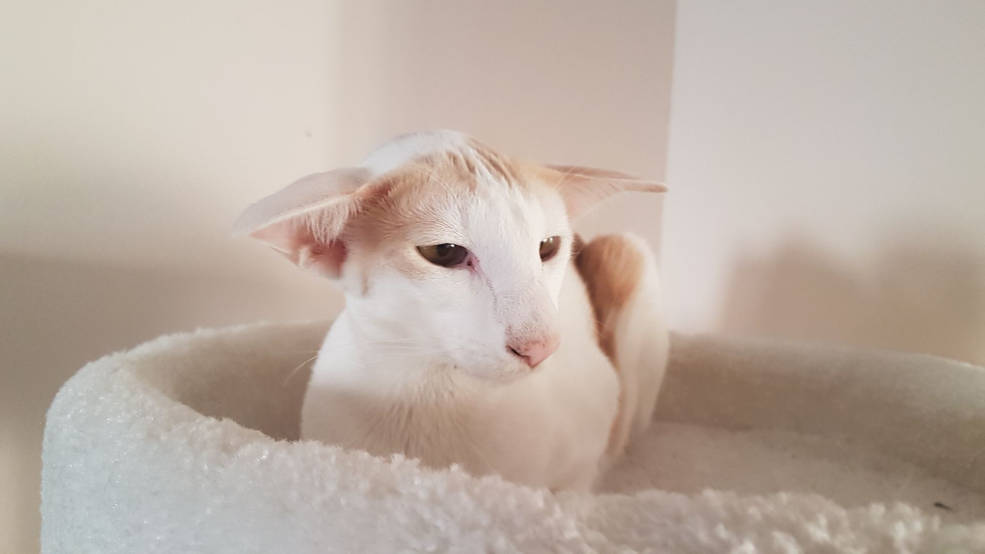 Karolina ist unsere erste Nachzuchtkatze nach einer zehnjährigen Zuchtpause. Sie ist sehr typvoll. Sie hat, wie ihre Mutter Myra, sehr schön gesetzte Ohren und ist so elegant, wie Ihr Vater Boris. Sie hat die Farbe creme mit weiß, wobei der Weißanteil überwiegt und als "van" bezeichnet wird, da sie außer am Kopf und am Schwanz nur jeweils einen Farbfleck an den Flanken aufweist. Diese Farbverteilung ist bei Orientalen besonders selten.